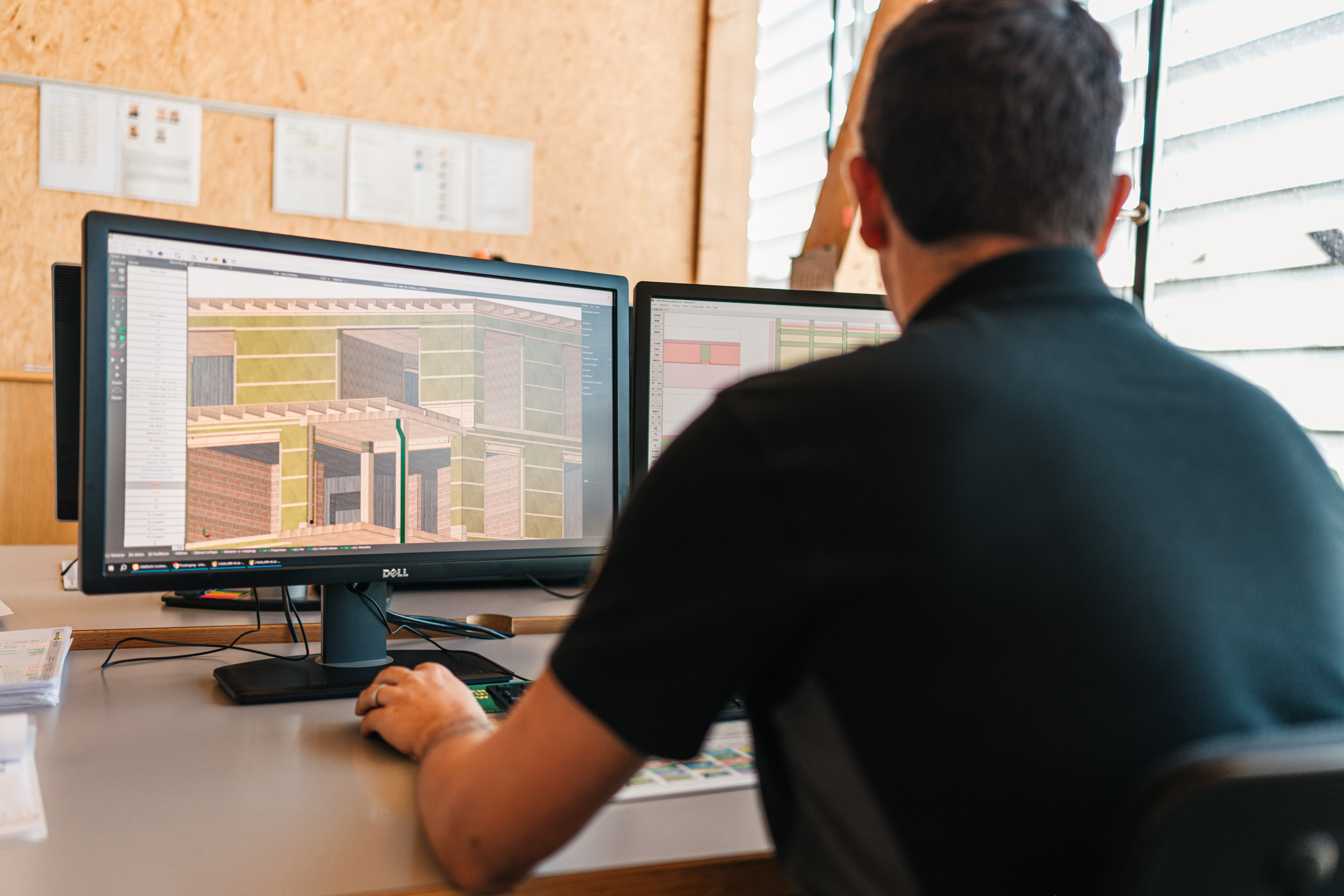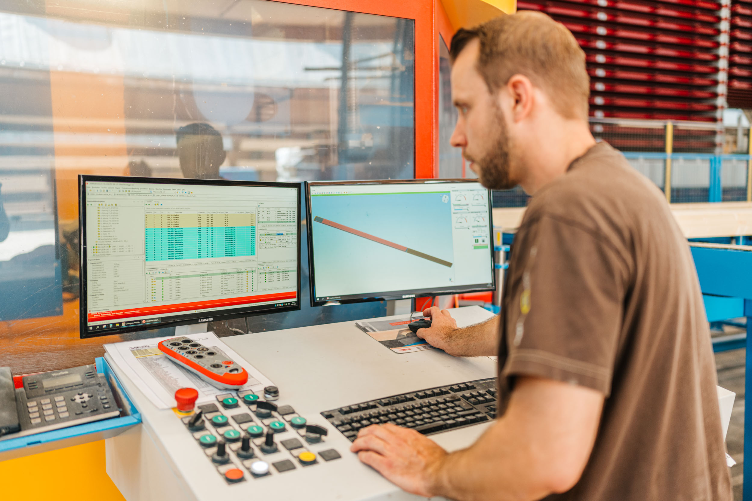 In unserem Holzbautechnologiezentrum in Langenthal zeichnen unsere Konstrukteure 3D-Bausätze für Holzbauten, die auf unserer Produktions-Strasse mithilfe von CNC-Technik produziert werden. Wir produzieren sowohl für uns als auch für andere Holzbaubetriebe.