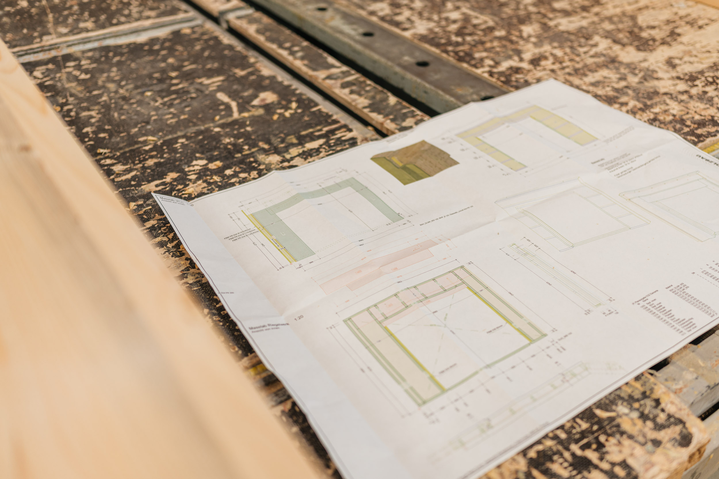 Ein Zusammenspiel aus Konstruktion und Produktion: In der Konstruktionsabteilung wird das Gebäude als 3D-Modell erstellt. In diesem Modell sind alle Bauteile, die verwendet werden, als Datei so definiert, dass sie maschinell gefertigt werden können. In der CNC-gestützten Produktion werden aus Balken, Platten und Dämmmaterial die Elemente für Wand, Boden und Decke hergestellt.