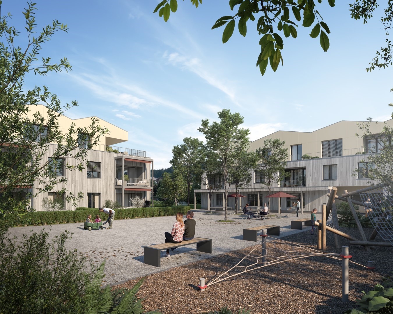In Lotzwil realisieren wir elf Wohneinheiten. Total 80 Miet- und Eigentumswohnungen werden in Holzbauweise gebaut. Das Herzstück der Überbauung ist der zentral gelegene öffentliche Platz. Die Gebäude sind unterschiedlich in Ausrichtung und Erschliessung angeordnet. Die insgesamt sieben Gebäudetypen verfügen über eine individuelle Architektur, welche sich unter anderem in Volumen, Ausrichtung und Grundrisstypologie voneinander unterscheiden. Auf diese Weise gelingt es dem Projekt, die unterschiedlichsten Bedürfnisse und Erwartungen je nach Lebenssituation abdecken zu können. Die Überbauung ist oberirdisch weitgehend autofrei. Auf dem Grundstück befinden sich lediglich einige Besucherparkplätze.
