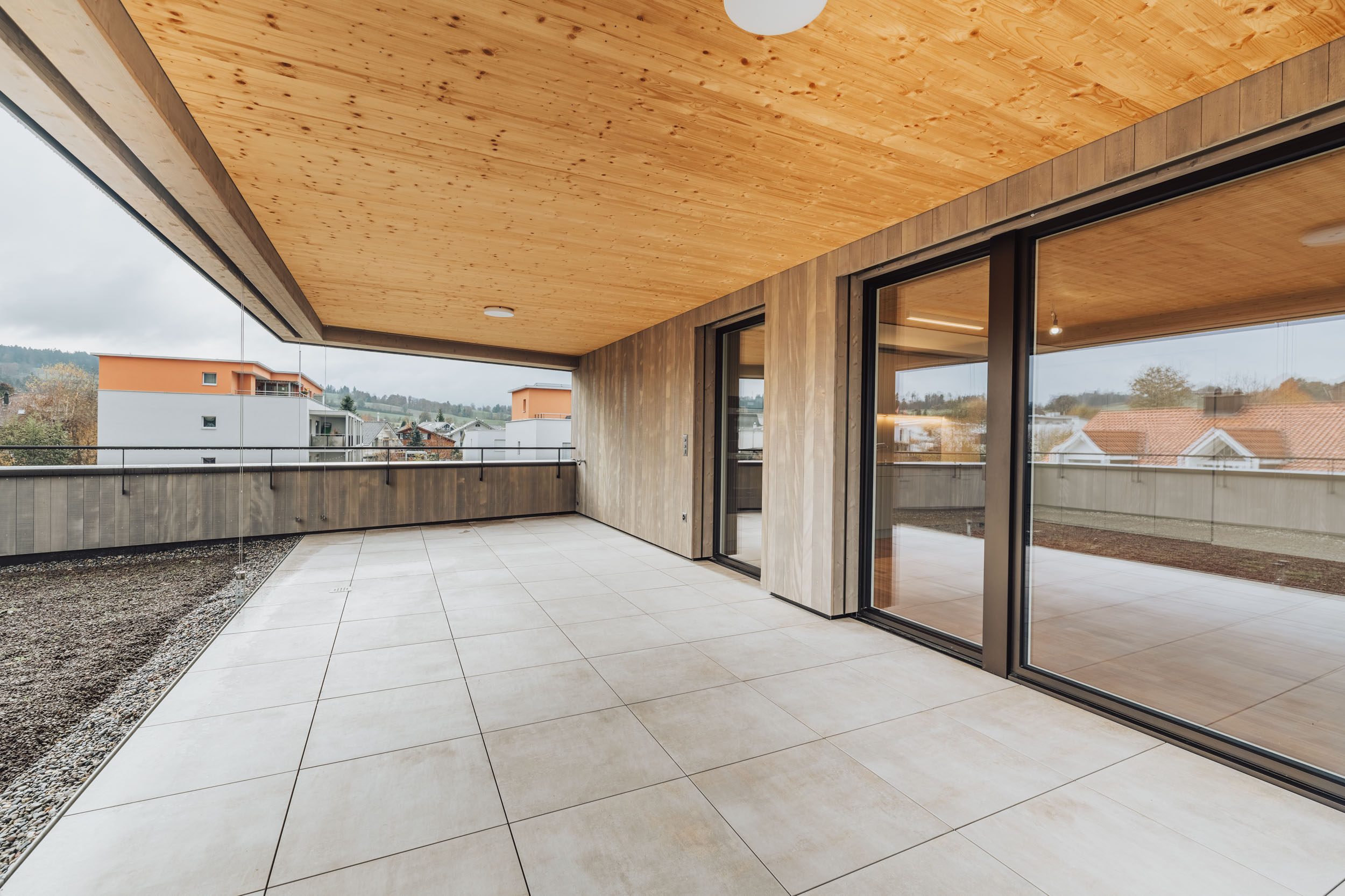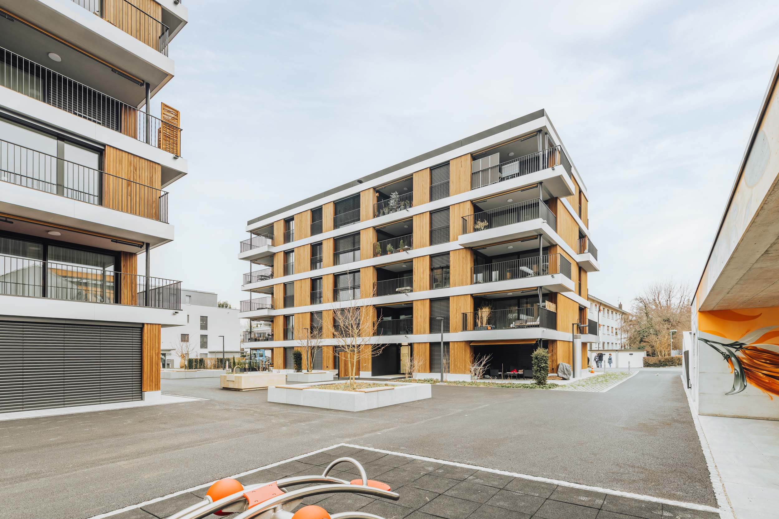 Es wird CO2 der Atmosphäre entzogen und langfristig gespeichert. Da eine Holzfassade kaum sommerliche Hitze speichern kann, strahlt sie auch keine Hitze in die Umgebung (Balkon) oder in die Wohnung ab. Das ist im Sommer ein grosser Vorteil für die Benutzbarkeit der Aussenräume und verbessert das Stadtklima.